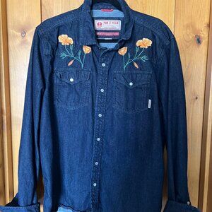 100% cotton indigo denim. Custom Iron & Resin embroidered California poppies design. Double pearl button snaps on the cuffs. Double chest pockets with top entry flap and pearl button snap closure.