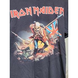Show off your love for Iron Maiden with this iconic black t-shirt featuring The Trooper design. Perfect for any fan of the metal hair band, this original and authentic shirt is a must-have addition to your music memorabilia collection. The shirt is size Large and is made with high-quality materials for a comfortable fit. Whether you're heading to a concert or just want to sport some rock and pop style, this shirt is sure to turn heads.