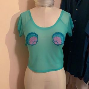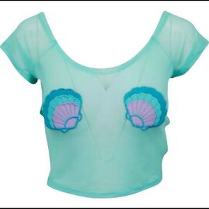 Mesh crop top with seashell appliqués by Iron Fist. This is a size XL, fits like juniors. Brand new boutique product in it’s original factory packaging.