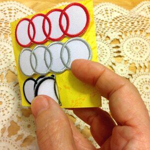 Three new, small (1" x 3") iron-on patches, embroidered trim, bearing Audi Symbol.