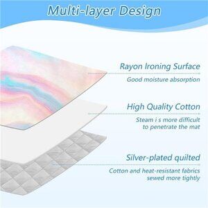 High Quality:This ironing mat adopts a multi-layer design, with a surface made of Rayon lroning and good moisture absorption. High quality cotton in the middle makes it Steam more difficult to penetrate the mat. The bottom layer is coated with 210 silver-plated quilted, with cotton and heat-resistant fabrics sewed more tightly. The ironing pad can be used on both sides, making it more durable