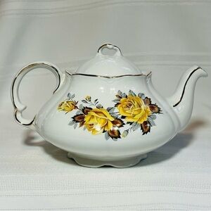 Ironstone Teapot VTG Ellegreave 598A Yellow Roses, Scalloped, Gold Trim EUC Made In England