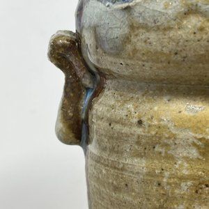 Rustic and primitive vase. Two ear shaped handles, rough textured all around the base. Glossy finish on the top section that shows heavy crazing. There is an incised diamond shaped design in one area. Also a concave area with a vertical orientation.