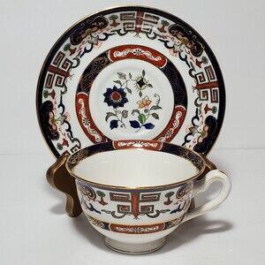 Vintage Ironstone Ware teacup and saucer made in Occupied Japan between 1945-1951. Blue and red Asian design. Some gold loss on handle.