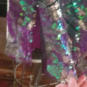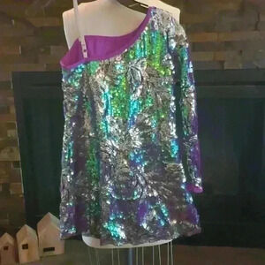 One long sleeve, adjustable strap at cami side, attached biketard and side slits.
