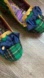 New condition Irregular Choice Prim and Proper mid-heel shoe, green tartan check pattern, a scalloped gold trim, a blue bow detail, and a glitter-covered heel