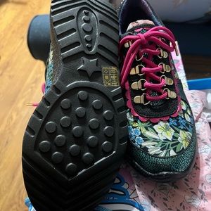 Pop these cuties on and dance your way to happy days! A fun and functional pair of shoes, these flats are here to show you how to party. A speckled black sole is paired with a metallic teal toe and heel, and a blue and green floral fabric, paired with pink scalloped details and matching laces. Perfect for adding that extra shimmer on the go, add these beauties to your wardrobe today!
