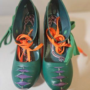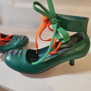One Pair of NWOT Irregular Choice early aughts Green Kitten Heel Ankle Strap Lace Up Pump with Purple decorations and Orange Laces. I do not remember the name of this shoe style.