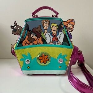 cuz monsters aren't real. This bag has a vegan leather construction, is in the shape of the mystery machine van, has the whole gang on the front, embossed and embroidered detailing, a top handle, an adjustable and removable shoulder strap, a top zip