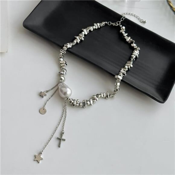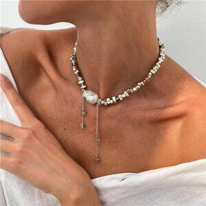 This 14K gold-plated irregular choker necklace is a total head-turner! With its geometric tassel design, high-polish baroque pearl, and metal bead details, this piece blends artistic flair with modern luxury. It’s like wearing a work of art — bold, trendy, and effortlessly chic.