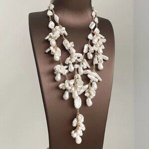 Make an unforgettable statement with this spectacular necklace! Featuring dozens of irregular, high-luster pearls and a dramatic cascading design, this piece is the definition of maximalist luxury.