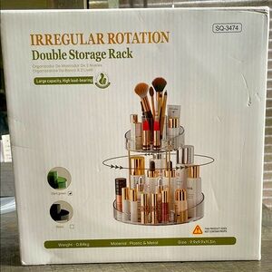 Organize your cosmetics with the Irregular Rotation Double Storage Rack. This sleek black rack offers ample space and easy access to your essentials. Perfect for any vanity.