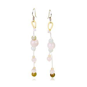 The irresistible bead Rose Quartz Earrings have a playful appearance made possible by the color scheme and the orientation of the beads alike. The long lavender cord splits off toward the end where small spherical rose quartz, greenish yellow and jade beads are found. In the center are larger rose quartz beads.