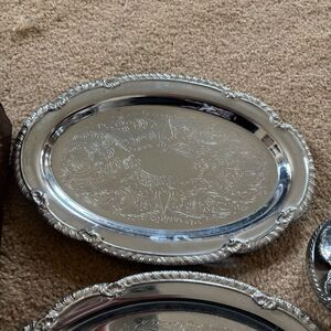Irvinware Sugar & Creamer Set. No sugar bowl lid but extra tray. Chrome plated. Trays are 9.5” x 6.5”. Items in good condition, one of the trays has some slight corrosion on bottom.