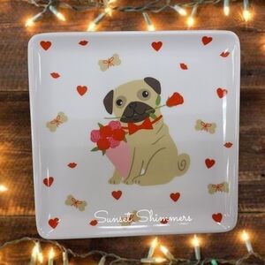 NEW ISAAC MIZRAHI Dog PUGS & KISSES 19" MELAMINE SERVING TRAY & 4 Appetizer/ Dessert PLATE SET.