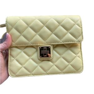 100% Quilted Leather Bridgehampton Crossbody Bag. Adjustable shoulder strap, shiny gold hardware, twist-lock closure.Polyester/cotton lining in tan signature logo fabric. Long slip pocket on back, zip compartment inside, one inside slip pocket and 4 credit card slots. Goldtone chain crossbody strap.