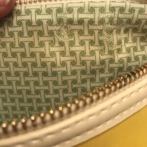 Fabric interior is a lovely green and ivory print, small blemish on fabric inside large compartment, see pic.
