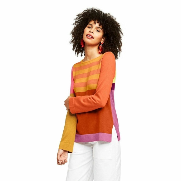 Contrasting colors, stripes and colorblock designs make the Colorblock Long-Sleeve Sweater from Isaac Mizrahi for Target a must-have piece in any collection of iconic looks. With burnt orange, mustard yellow, pink and purple hues, this crewneck sweater boasts a beautiful blend of bright and rich colors for dynamic style. A mix of striped patterns and colorblock sections showcase Isaac Mizrahi’s affinity for bold, exuberant design.