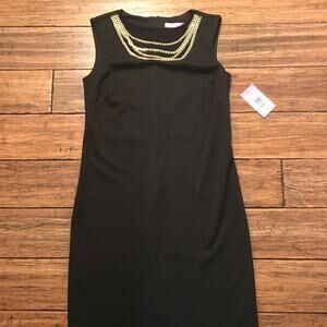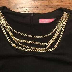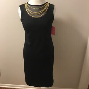 Isaac Mizrahi dress with quadruple gold chain and mesh neck detail. Hidden back zip with hook and eye closure. 75% polyester, 20% rayon, 5% spandex. This has a lot of stretch to it. New with tags.