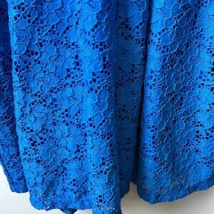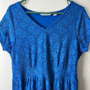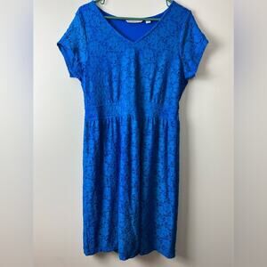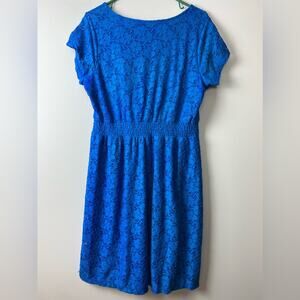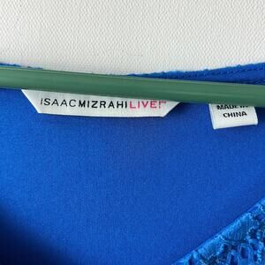 Gently used Isaac Mizrahi dress. This is a women’s medium. Excellent blue color. Floral type pattern throughout. Body: 95% nylon, 5% spandex. Lining: 100% polyester.