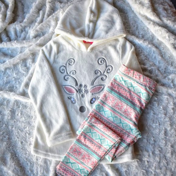Your little elf will be warm and cozy this winter in this super soft 2-piece set from Isaac Mizrahi. This adorable outfit includes a long sleeve fleece top with a soft attached hood, and a whimsical reindeer face and antlers embroidered on the front in silver, blue and pink. Fleece-lined, elastic waist leggings with a lovely pink, teal, and grey fair isle design complete the look. Top is 100% polyester; pants are a cotton/poly blend. NWOT