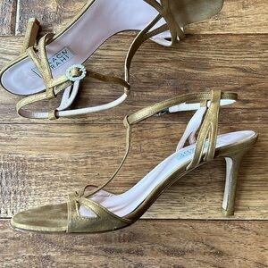Isaac Mizrahi Gold Metallic Strappy Open Toe Heels Rhinestone Buckle Accent Sz 8
