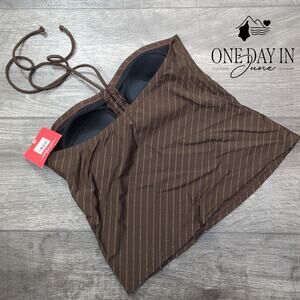 This brown halter creation from Isaac Mizrahi emerges like a desert mirage of sophisticated comfort, engineered with padded perfection that defies the conventional boundaries of swimwear and street style. The nylon-spandex blend stretches across reality with the fluid grace of a roadster hugging mountain curves, delivering that rare fusion of support and freedom that makes civilized society bearable. Brand new and untouched by the chaos of retail existence, this piece represents the kind of sartorial salvation that transforms ordinary mortals into creatures of undeniable presence.