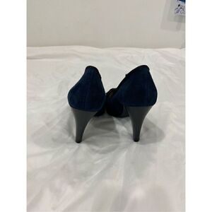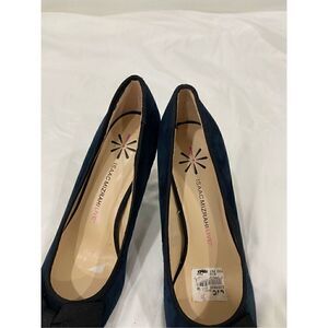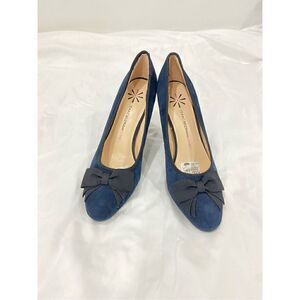 Isaac Mizrahi Julia blue suede 4” high black heels and bow size 8