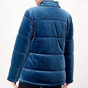Velvet puffer NWOT Teal Blue Size XL Fabrication: woven Hardware: zipper and snap closure Features: long set-in sleeves, angled welt pockets Fit: semi-fitted; follows the lines of the body with added wearing ease Length: missy length 27-1/2" to 29-5/8"; plus length 30" to 33-1/2" Content: shell 92% polyester/8% spandex; lining 97% polyester/3% spandex; filling 100% polyester Care: machine wash, tumble dry