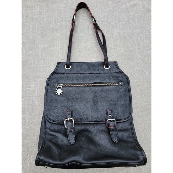 Very gently used, and in great condition. There is a pen mark on the underside of the main flap closure, otherwise interior is great. Lots of storage space and pockets. Interesting strap design, silver hardware. See photos!