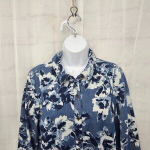 Isaac Mizrahi Live Blue White Floral Button Down Blouse Cottagecore Boho 12