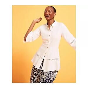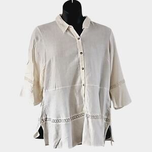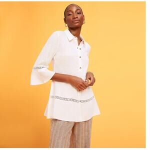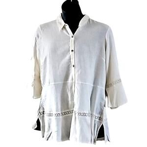 Isaac Mizrahi tunic, linen blend blouse, lace trim top, white summer top, breathable fabric, boho chic, beach cover-up, resort wear, casual button-down, lightweight tunic, vacation fashion, trendy women’s blouse, relaxed fit, coastal style, easy layering piece.