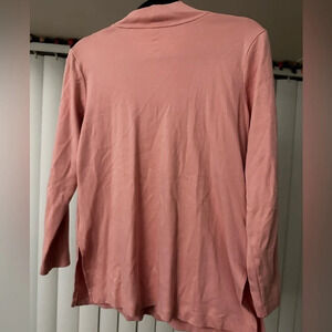 Features: V-neckline with overlapping self inset, 3/4-length set-in sleeves, shirttail hemline, side slits