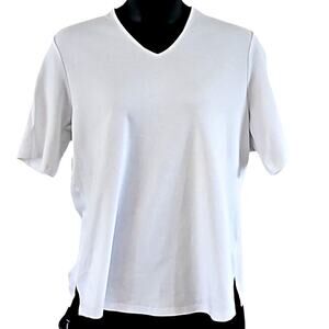 Isaac Mizrahi Live! tunic, white V-neck top, soft elbow sleeve tunic, everyday essential shirt, casual relaxed-fit blouse, layering basic tee, comfortable knit top, breathable summer tunic, versatile white shirt, stylish everyday wear, classic wardrobe staple.