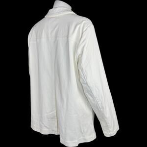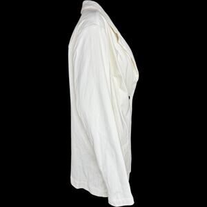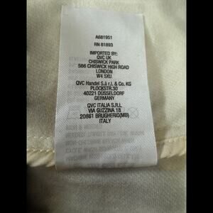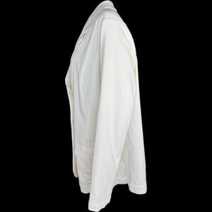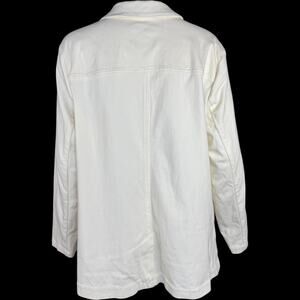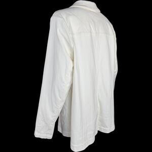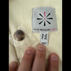 This item is a Isaac Mizrahi Live! Knit Denim Classic Slimming Blazer in the color Cream. It is a size 1X. This item has never been worn. It does not have attached tags but does have the original packaging that it came with. I opened the packaging in order to take photos and measurements for this listing.