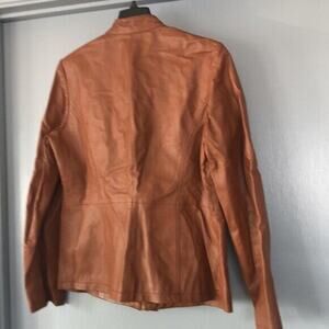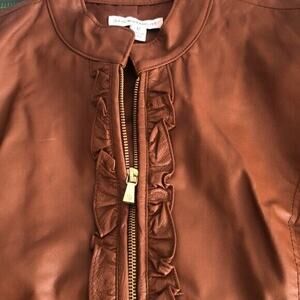 Fully lined leather jacket with ruffle down the front. Very feminine.