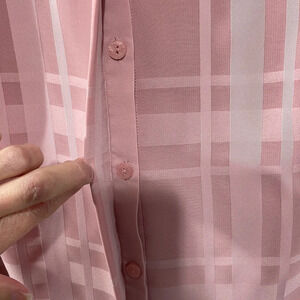 Isaac Mizrahi Live! Long Sleeve Pink Plaid Button Front Blouse in size 8. Great preowned condition. Hidden buttons down the front, button cuffs. Top layer is sheer with a lined body and round hem. Please see photos for approximate measurements and details. Item may show a difference in color based upon photography and perception. Photos are part of the description, as everyone’s level of condition may vary. From smoke free and pet free home. All packages are shipped the same or next business day.