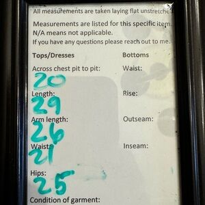 20" armpit to armpit, 29" length, 26" arm length, 21" waist, 25" hips