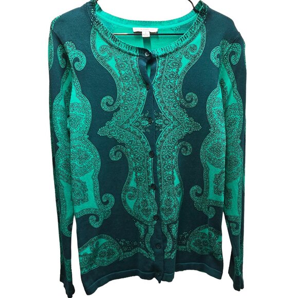 Isaac Mizrahi Live! Paisley Printed Cardigan/Sweater Green/Navy Button Closure S