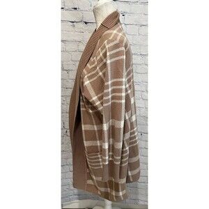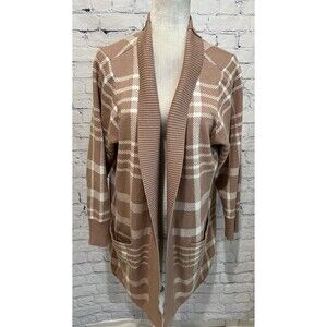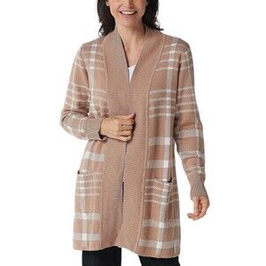 The Isaac Mizrahi Live! Pattern Jacquard Cozy Cardigan in Cappuccino Plaid, size 1X, is a stylish and versatile sweater perfect for travel, casual wear, work, and business occasions. Made from a blend of nylon, rayon, and cotton in a tight-knit fabric, this long-sleeved cardigan features a relaxed fit, making it comfortable to wear during the winter and fall seasons. The warm brown color and plaid pattern add a touch of sophistication to the overall look, making it a must-have for women looking for a cozy yet chic option in their wardrobe. There is a little pilling but nothing to take away from this great sweater. 26 inches pit to pit and 34 inches long. Smoke free home.