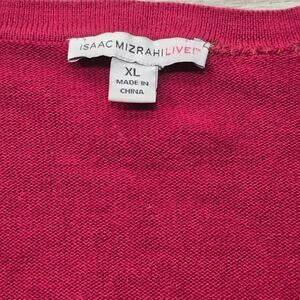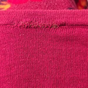 Isaac Mizrahi Live! Red Purple Floral Print V Neck Long Button Cardigan Sweater. Faint mark on the sleeve and stitching on the back as shown, otherwise great condition.