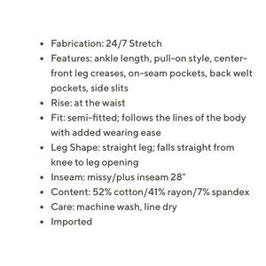 Features: ankle length, pull-on style, center-front leg creases, on-seam pockets, back welt pockets, side slits