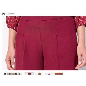 Fabrication: twillFeatures: pleated front, encased elastic waistband, center front leg pleats, back welt pocketRise: at the waistFit: semi-fitted; follows the lines of the body with added wearing easeLeg Shape: wide leg; widens fashionable from thigh to leg openingInseam: missy/plus inseam 30.5"Content: 92% polyester/8% spandexCare: machine wash, tumble dryImported