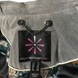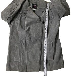 Isaac Mizrahi Live! Concrete Gray 3/4 Zippered 100% Suede Leather 2 Slit Pockets on the Front Fully Lined Motorcycle Jacket Wrap Coat Women’s Size 4. This jacket is preowned and in very good condition.