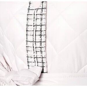 Features: tweed accents, removable belt, welt seam pockets, long sleeves
