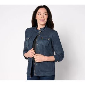 Whether you're headed to the office, your kid's sporting event, or (insert fun fall activity here!) grab this sleek, suede jacket before you head out the door. With an adjustable drawstring and front flap pockets, it's functional, fashionable, and fabulous. From Isaac Mizrahi Live! .Condition: