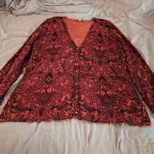 Stylish women's red and black patterned long sleeve button-up sweater by Isaac MIzrahi. Perfect for any occasion. size XL. pit to pit measures 23 inches. length 28 inches.