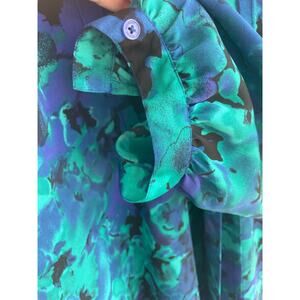 Beautiful purple, green jewel tones on this floral ladies blouse by Isaac Mizrahi Live. Size Large, pleated tuxedo look to front, v neck opening with 1 button and tie at neckline.