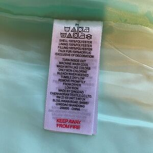 Stylish mint green puffer vest with snowflake pattern. Features a cozy faux fur trim on the hood.