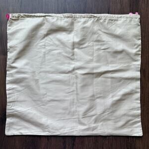 Isaac Mizrahi New York branded dust bag in beige with pink logo at front. Made from soft fabric with a drawstring closure accented with pink ties. Perfect for storing handbags, shoes, or accessories while keeping them clean and protected. Medium-to-large square size at approximately 19.5" x 21.5".